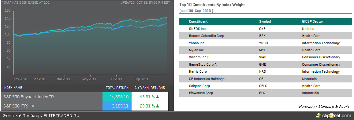 К слову о тенденции в поощрении акционеров через Buyback, которая актуальна на фоне низких ставок удерживаемых ФРС за счет проводимых программ по выкупу гособлигаций. В агентстве, рассчитывающем динамику индексов семейства S&P, в недавнем прошлом даже создали соответствующий индекс S&P 500 Buyback Index, и если посмотреть на его динамику за последний год она выгодно отличается от самого S&P500. Данный индекс за год с ноября 2012 вырос почти на 44% против 28% S&P500. Ранее мы отмечали подобную тенденцию.
