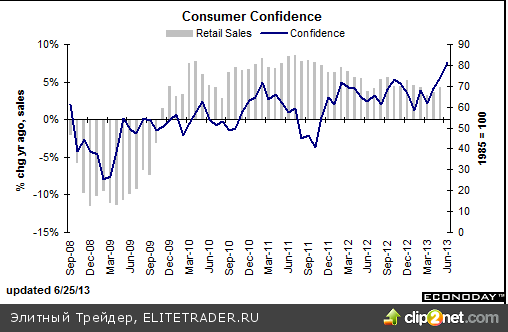 Исследовательская организация Conference Board сообщила о снижении индекса потребительского доверия в октябре до шестимесячного минимума - 71,2 пункта с пересмотренных сентябрьских 80,2 пункта. Сам факт снижения был ожидаем, и обусловлен последствиями приостановки работы правительственных учреждений в первой половине месяца, однако аналитики ожидали снижения только до 75 пунктов. Линн Франко, директор исследовательского центра в Conference Board подчеркнула, что, не смотря на временный характер данного явления, в ближайшие месяцы показатели уверенности будут волатильны.