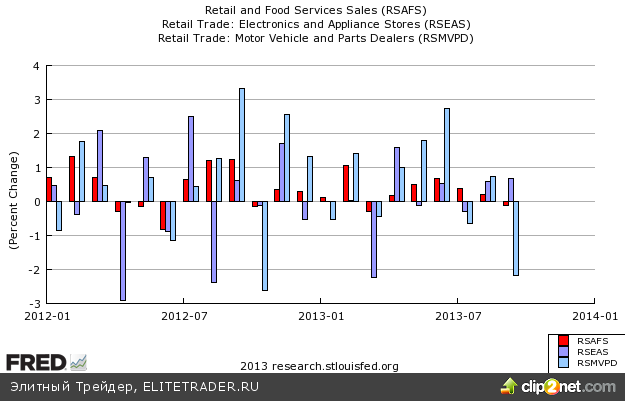 Отчет по розничным продажам указал на снижение показателя впервые с марта. Продажи снизились на 0,1% до $425,9 млрд., тогда как ожидался рост на 0,1%. Исключая продажи автомобилей, показатель вырос на прогнозные 0,4%. Продажи авто снизились на 2,2%. Поддержку оказал рост продаж электроники на 0,7%, в частности продажи новых смартфонов Apple. Данные по продажам наиболее близкие к потребительским расходам учитываемым в ВВП - без учета автомобилей, бензина и строительных материалов выросли на 0,5% против прогнозных 0,4%.