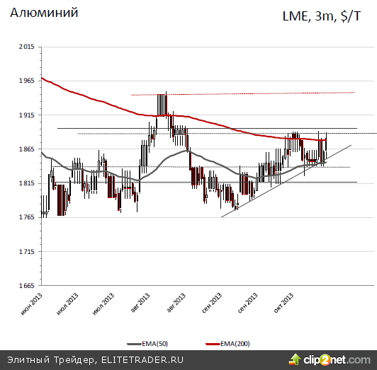 Алюминий тестирует сильный уровень сопротивления $1900/т,его преодоление будет сигналом к выходу в диапазон $1900-1945/т, однако такой исход менее вероятен, нежели коррекция с текущих уровней в район $1860-1870, где металл будет ощущать себя более уверенно. Кроме того, данные уровни лежат в середине довольно стабильного коридора $1845-1885/т, где алюминий находится с начала октября.