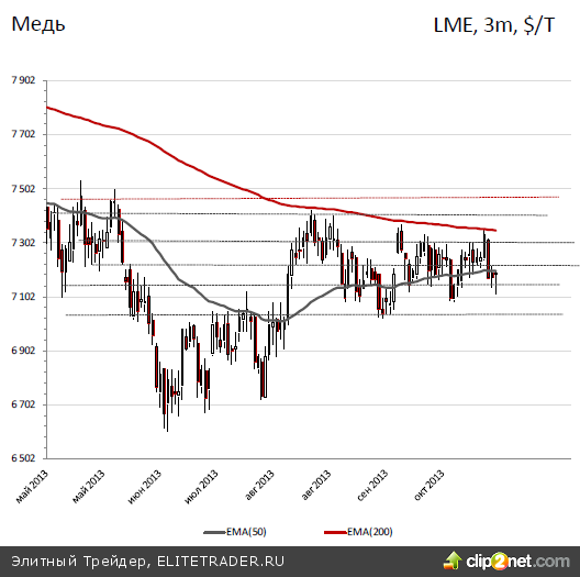 Котировки меди не могут пробить вверх 20-дневную EMA, которая ограничивает им выход к верхней границе осеннего коридора $7300/т. Движение вниз ограничено поддержкой $7140/т, уход ниже которой возможен, однако, вероятно, не ниже $7100-7120/т. В ближайшие дни ожидаем сохранения спокойствия в котировках меди, которые могут продемонстрировать некоторый рост, но пока не выйдут за пределы боковика.