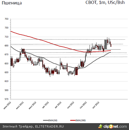 Котировки пшеницы в конце минувшей недели корректировались, практически достигнув к текущему моменту поддержки 685 центов за бушель. В случае сохранения "медвежьих" настроений на рынке возможно падение до 680 центов, тогда как рост ограничивается уровнем сопротивления 695 центов.