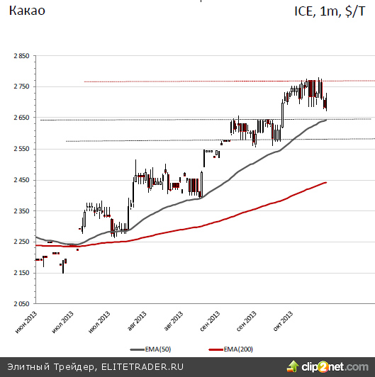 После достижения пиковых значений 4кв11 котировки какао корректируются, еще не определившись с дальнейшим направлением движения. Ближайший уровень поддержки $2685/т довольно слаб, вследствие чего возможен откат вплоть до $2645/т, однако в дальнейшем котировки вернутся к текущему уровню, чтобы продолжить рост.