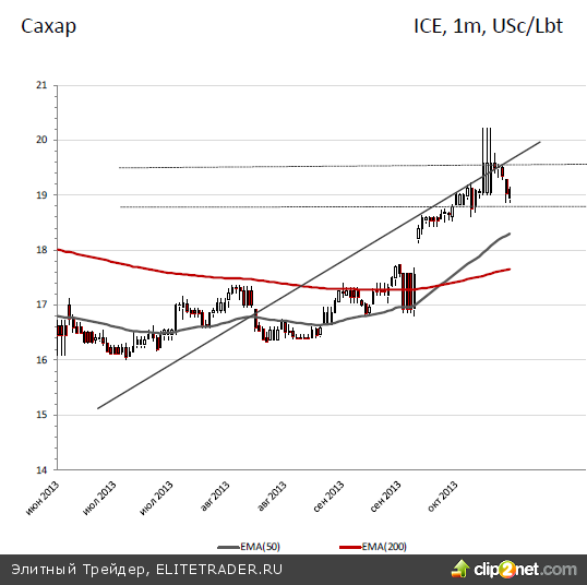 Котировки сахара отыгрывают коррекцию после стремительного роста на новостном фоне. В ближайшие дни возможно пробитие вниз 20-дневной EMA и в случае успеха - закрепление в районе 18,6-18,7 цента за фунт.