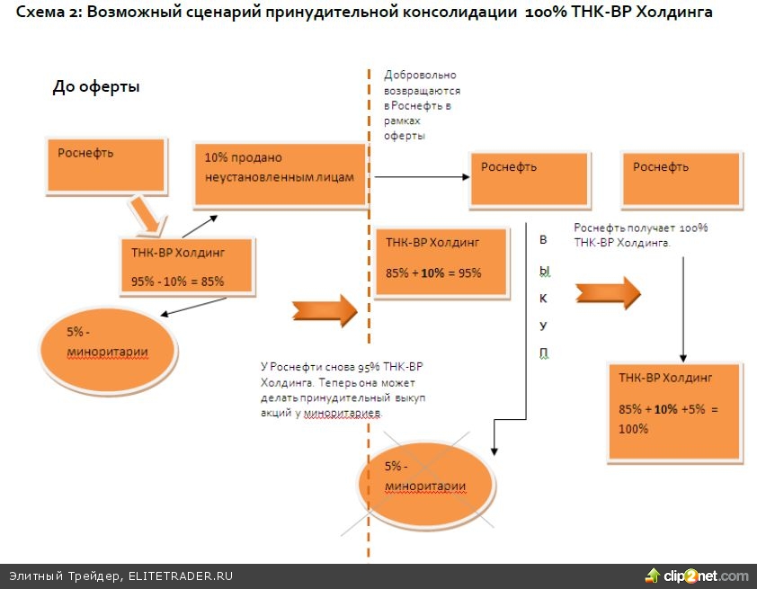 Вернемся к таинственной сделке Роснефти по продаже 10% РН-Холдинга. О перипетиях миноритариев мы рассказали для того, чтобы показать ситуацию в компании. В настоящее время поведение Роснефти в отношении миноритариев РН- Холдинга изменилось: хотя компания и не обязана была делать им оферту, сейчас (так и быть) Роснефть готова предложить (срок оферты, правда, неизвестен) по 67 рублей за обыкновенную акцию. Миноритариев, особенно западных, конечно, такая цена не устраивает, причем вся эта история не способствует росту интереса инвесторов к акциям госкомпании, повышая привлекательность инвестиций в другого нефтяного мэйджора, Лукойл. Какой цели может служить продажа (скорее всего, временная) 10% акций РН- Холдинга? Она может быть полезна, если миноритарии не захотят принять добровольную оферту и Роснефть решит пойти по схеме принудительного выкупа по этим ценам. Напомним, что по «Закону об акционерных обществах» (ФЗ №208, статья 84.8, пункт 1), реализовать принудительный выкуп акций можно только если 10% акций общество «доберет» в рамках обязательного/добровольного предложения! Таким образом, предъявление в рамках добровольной оферты 10% РН- Холдинга позволит Роснефти получить законное право принудительно выкупить все оставшиеся акции у миноритариев.