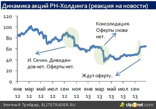 Прежде всего, необходимо сказать, что ТНК-ВР Холдинг всегда считался хорошей компанией в плане выплаты высоких дивидендов среди «коллег» по сектору. Но в октябре 2012 г. глава Роснефти И. Сечин рассказал, как будет проходить консолидация ТНК-ВР International и что: а) вопрос выплаты больших дивидендов ТНК-ВР Холдингом не стоит на повестке дня, и б) более того, вопрос о выкупе доле миноритариев не рассматривается. Отметим, что при покупке ТНК-ВР Int. Роснефть действительно, с точки зрения законодательства, не обязана была делать оферту акционерам ТНК-ВР Холдингу о выкупе акций, т.к. покупала не их напрямую, а «материнскую» компанию – т.е. ТНК-ВР. Однако столь кардинальное изменение акционерной политики пользующейся уважением компании-эмитента без согласования с миноритариями смотрелось достаточно плохо. Поэтому прокатилась серьезная волна недовольств среди крупных миноритарных акционеров, среди которых есть достаточно известные, например, М. Мобиус - фонд Templeton, а также East Capital, Prosperity и т.д. Впрочем, миноритарии продолжали ждать консолидации и все-таки надеялись на годовые дивиденды, а котировки акций ТНК-ВР Холдинг лишь постепенно стали сдавать свои позиции. В июне 2013 г. миноритарии получили еще один удар: ТНК-ВР Холдинг, уже в лице Роснефти, снова решил не выплачивать дивиденды. Теперь недовольство приняло куда больший размах и потребовало реакции руководства страны. В результате Роснефти было настоятельно «рекомендовано» не оставлять миноритариев и объявить оферту. Госкомпания в конце сентября объявила о том, что может выкупить акции по 67 руб., а привилегированных - по 55 руб. Роснефть уже представила оферту по выкупу акций в Службу ЦБ РФ по финансовым рынкам. Естественно, такие цены не находят поддержки у миноритариев, которые хотели бы видеть 80 или 90 руб. по обыкновенным акциям, т.е. уровни прошлого года, тем более что бизнес РН-Холдинга не ухудшился, в то время как отраслевой индекс «нефть и газ» индекса ММВБ находится на 12% выше. Интересно взглянуть на график акций РН-Холдинга в плане реакции на все эти события.