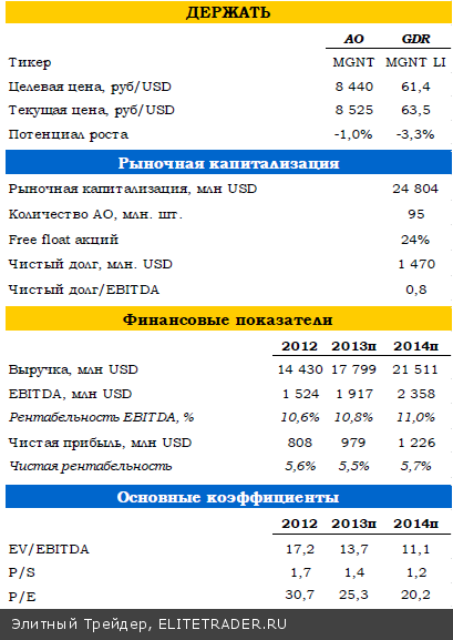 Наши долларовые прогнозы выглядят несколько заниженными на фоне результатов за 9М13, так как мы заложили в модель более интенсивное ослабление рубля. С учетом наблюдаемой динамики валютных курсов, ожидаемая нами выручка по итогам года в районе 587,4 млрд рублей выглядит вполне правдоподобным ориентиром. Магнит движется с некоторым опережением наших ожиданий (мы традиционно придерживаемся сдержанно-оптимистичной позиции при составлении прогнозных сценариев), но пока мы считаем оценку справедливой стоимости на уровне 8440 рублей за бумагу корректной. Сейчас Магнит торгуется уже немного выше этого уровня.