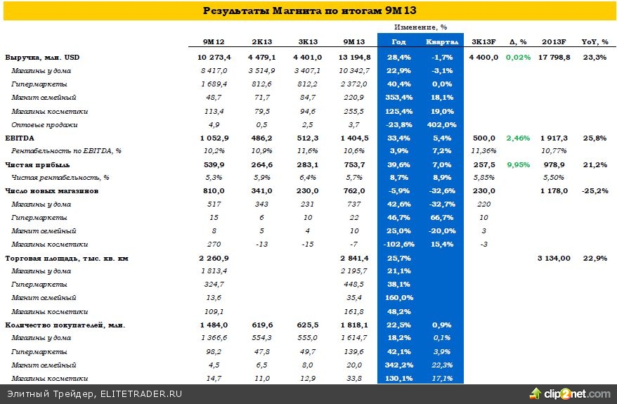 Магнит продемонстрировал умеренное снижение валютной выручки в 3К13, что связано с сезонным снижением активности потребителей, а также со значительным ослаблением рубля как раз в конце лета – в период подготовки к школьному сезону. В целом это было предсказуемо, и выручка осталась в рамках прогноза.