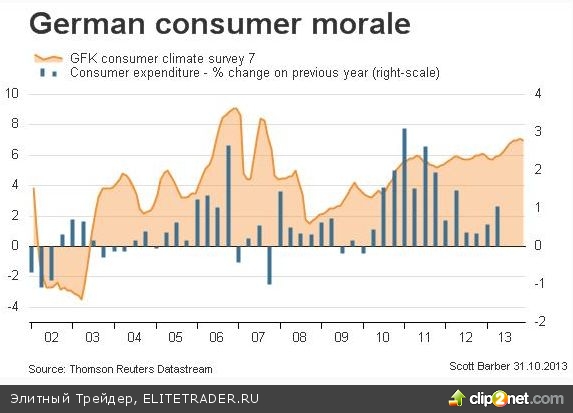 Розничные продажи в Германии в сентябре неожиданно сократились на 0.4%, при этом аналитики ожидали их роста на 0.4%. Кроме того, ниже прогнозов оказался немецкий индекс потребительского доверия Gfk – ноябрьский индикатор снизился с 7.1 до 7 пунктов, при этом экономисты прогнозировали 7.2 пункта. Затем вышли данные по безработице и инфляции в еврозоне – рост потребительских цен в октябре замедлился с 1.1% до 0.7% и стал минимальным с ноября 2011 года, при этом уровень безработицы остался на уровне 12%.