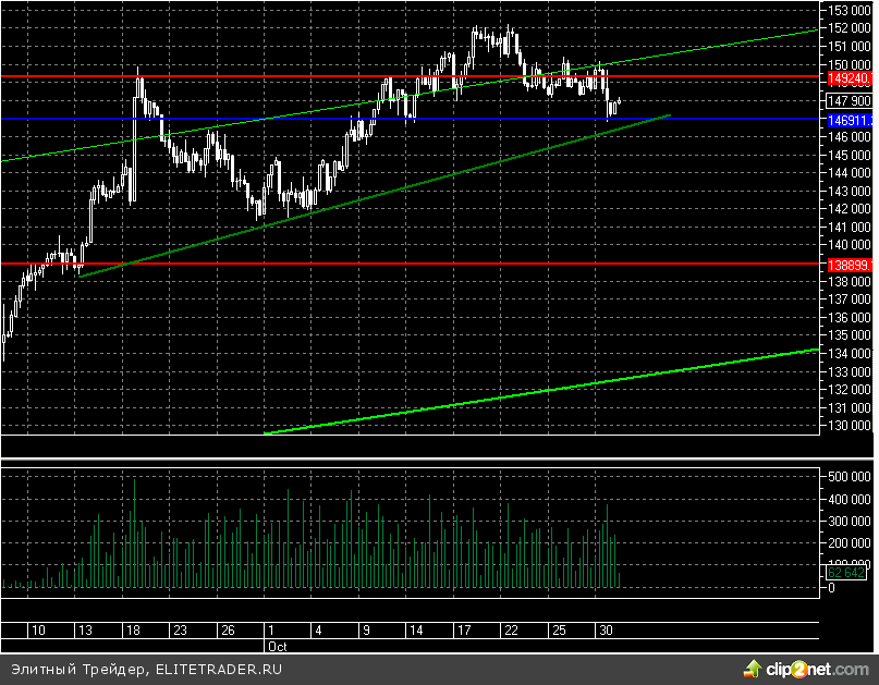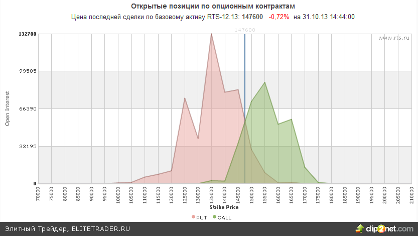 Между тем открытые опционные позиции по RIZ3 со сроком исполнения 15.11.13 сейчас также не дают однозначных сигналов. Максимальное количество опционов пут располагается в районе 135000, а опционов колл – на уровне 155000. Эти уровни являются очень значимыми, но находятся слишком далеко от 146000, где данный инструмент располагается сейчас.