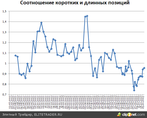 Обратив внимание на открытые юридическими лицами позиции по фьючерсу на индекс, можно заметить, что настроения крупных игроков за последние 3 дня практически не изменились и продолжают находиться в нейтральном состоянии. Соотношение коротких и длинных позиций сейчас составляет 0,95 против 0,93 тремя днями ранее.