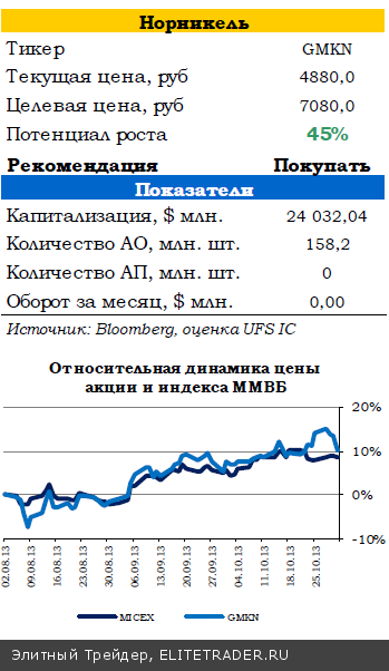 Мы нейтрально оцениваем производственные результаты «Норникеля» по итогам 9М13, так как в целом они вписываются в планы компании и наши ожидания. В 3К13 производство товарного никеля хорошо восстанавливалось после слабого 2К13 (+7%), производство меди было относительно стабильным (-2%), добыча металлов платиновой группы снизилась (-8% для платины, -7% для палладия). С учетом негативной динамики котировок в начале квартала, сокращение добычи и производства из-за плановых ремонтов выглядит вполне оправданным. Ухудшение качества рудного сырья несколько нас беспокоит, но пока ситуация выглядит контролируемо. Учитывая ценовую динамику, третий квартал будет не самым сильным в текущем году, однако начало 4К13 пока выглядит обнадеживающе.