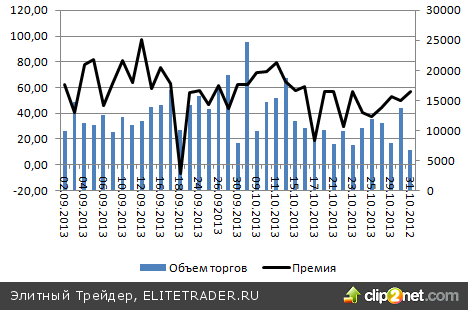 Динамика объемов торгов (тыс. кг) и премий ($ за унцию) на торгах в Шанхае