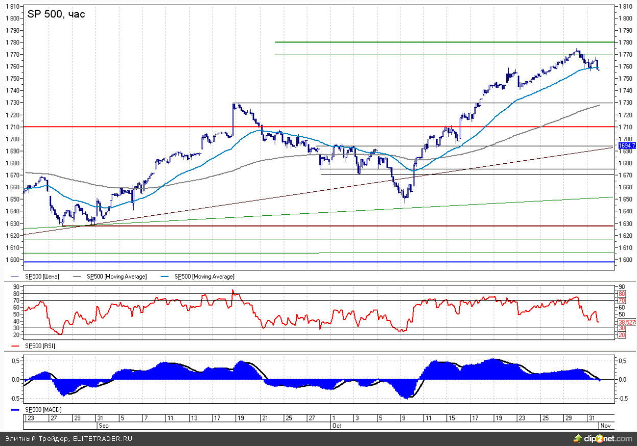 В четверг американский рынок продолжил свой медленный откат от недавних максимумов. После посещения целевой зоны торможения 1770-1780 мы наблюдаем за вполне закономерной коррекцией, которая в теории может перерасти во что-то более значительное.