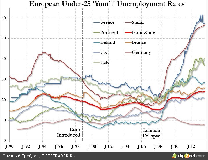 Показатели Франции и Италии также зашкаливают, а уровень безработицы среди молодежи на Кипре подскочил до 43% с 28% годом ранее. Среди всех стран выделяется Германия, где безработица на 20-летнем минимуме. Возможно, такая ситуация является началом катастрофы еврозоны. Zerohedge.com
