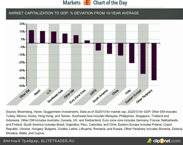 «Судя по рыночной капитализации, Восточная Европа и небольшие периферийные страны еврозоны остаются самыми недооцененными по сравнению с крупными регионами мира, - отмечает Минерд. - Также перепроданы рынки emerging markets, которые сильно упали в последние месяцы – это Индия, Китай и Южная Америка. BusinessInsider