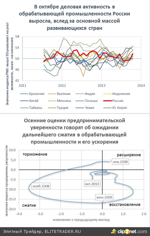 В то же время в динамике промышленности, по данным октябрьских опросов, никаких улучшений не произошло, и наблюдается четкая картина циклического спада из-за недостаточного спроса. Правда, индекс PMI деловой активности в обрабатывающей промышленности неожиданно выскочил в октябре «в зону роста», после 3-х месячного нахождения «в полосе спада», зафиксировав повышение закупочной активности и возобновление пополнения запасов готовой продукции на фоне роста спроса на инвестиционные товары. Однако не исключено, что в данном случае мы имеем дело просто со статистическим «выбросом» и каким-то событийным воздействием, например, разовыми госзакупками – все же база данного обследования довольно узка, лишь около 300 предприятий.