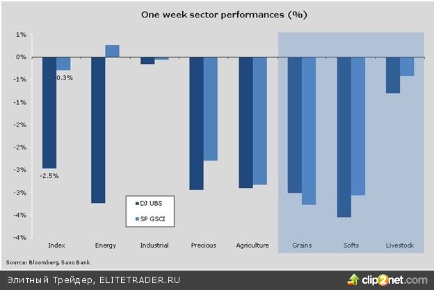 Индекс DJ-UBS, объединяющий в себе 19 ведущих сырьевых товаров, понизился более чем на 2% и достиг минимальной за три месяца отметки. Как уже было сказано, сельскохозяйственный сектор понес самые большие потери, при этом цены на кофе сорта Арабика и кукурузу, торгующуюся на рынке CBOT, опустились до четырехлетних и трехлетних минимумов соответственно, в то время как хлопок, по данным Bloomberg News, зафиксировал самое продолжительное падение с 1979 года.