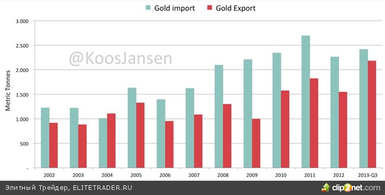 Здесь нет равных Поднебесной, которая продолжила наращивать импорт драгоценного металла в сентябре. По итогам первого осеннего месяца показатель составил 116,3 тонны, что несколько ниже среднегодовой цифры в 123,9. Чистый импорт был зафиксирован в размере 109,4 тонны, более чем в три раза превысив показатель сентября 2012 года.