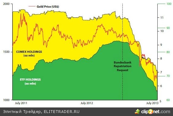 Динамика запасов ETF-фондов и COMEX в 2011-2013 годы, млн унций