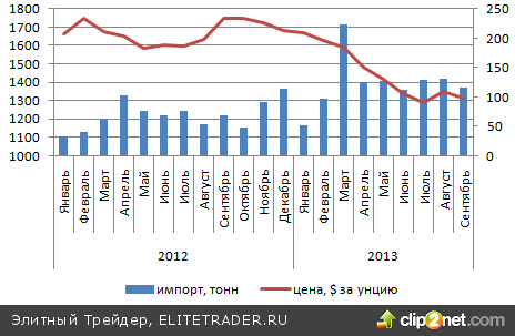 За январь-сентябрь объем поставок драгоценного металла на территорию Поднебесной достиг отметки 1114,5 тонны, на треть превысив результат всего прошлого года. Пиковым стал март, и с тех пор каждый месяц импорт золота обновлял максимумы 2012 года, зафиксированные в апреле и декабре. По итогам сентября темпы роста немного замедлились, а размер премий в Шанхае стабилизировался, но обвала не произошло, что позволило драгоценному металлу пережить исторически сложный для него октябрь.