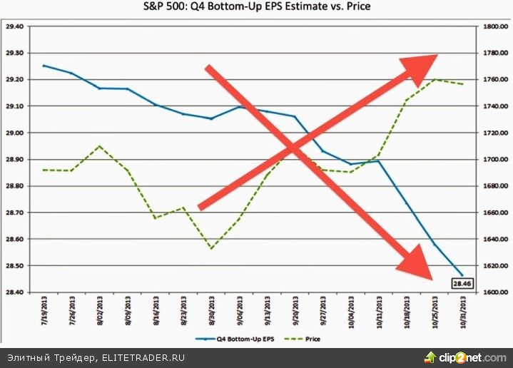 Цены на акции растут, хотя прогнозы по прибылям компаний падают. По данным FactSet, в течение октября аналитики понижали свои прогнозы по прибылям компаний из S&P 500 за IV квартал 2013 года – в итоге этот показатель снизился на 1.5% с $28.90 до $28.46. При этом индекс S&P 500 вырос на 4.5% и закрылся 29 октября на своем рекордном уровне.