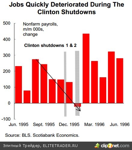 Например, в 1995 году при президенте Клинтоне было два «шатдауна». В результате в январе 1996 года число рабочих мест в экономике США снизилось на 6 тыс., однако в последующие месяцы отмечался бурный рост.