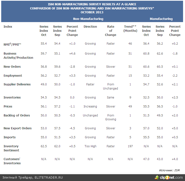 Стоит конечно учитывать и влияние собственно американских факторов. Так обнародованная статистика Институтом управления поставками (ISM) по деловой активности в сфере услуг, где, к слову сказать, занята львиная часть американцев, указала на рост индекса в октябре до 55,4 пункта с 54,4, тогда как аналитики ожидали снижения до 54 пунктов.