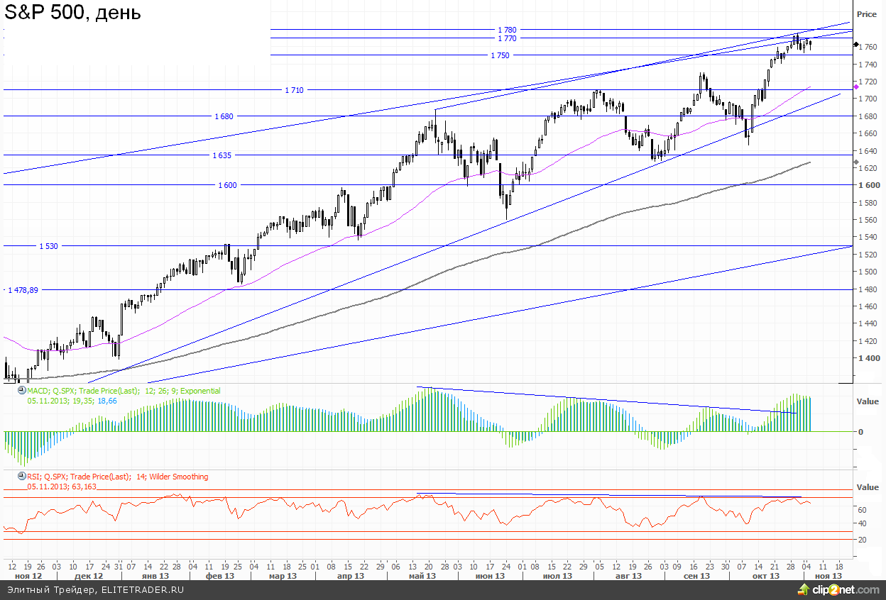 После прошедшего торгового дня общая техническая ситуация на американском рынке никаким образом не поменялась. Все осталось на своих местах. Сегодня индекс продолжает консолидироваться под ключевой зоной сопротивления 1770-1780, где недавно был установлен очередной исторический максимум. Все еще продолжается тенденция, когда любой откат используется в качестве момента для новых покупок.