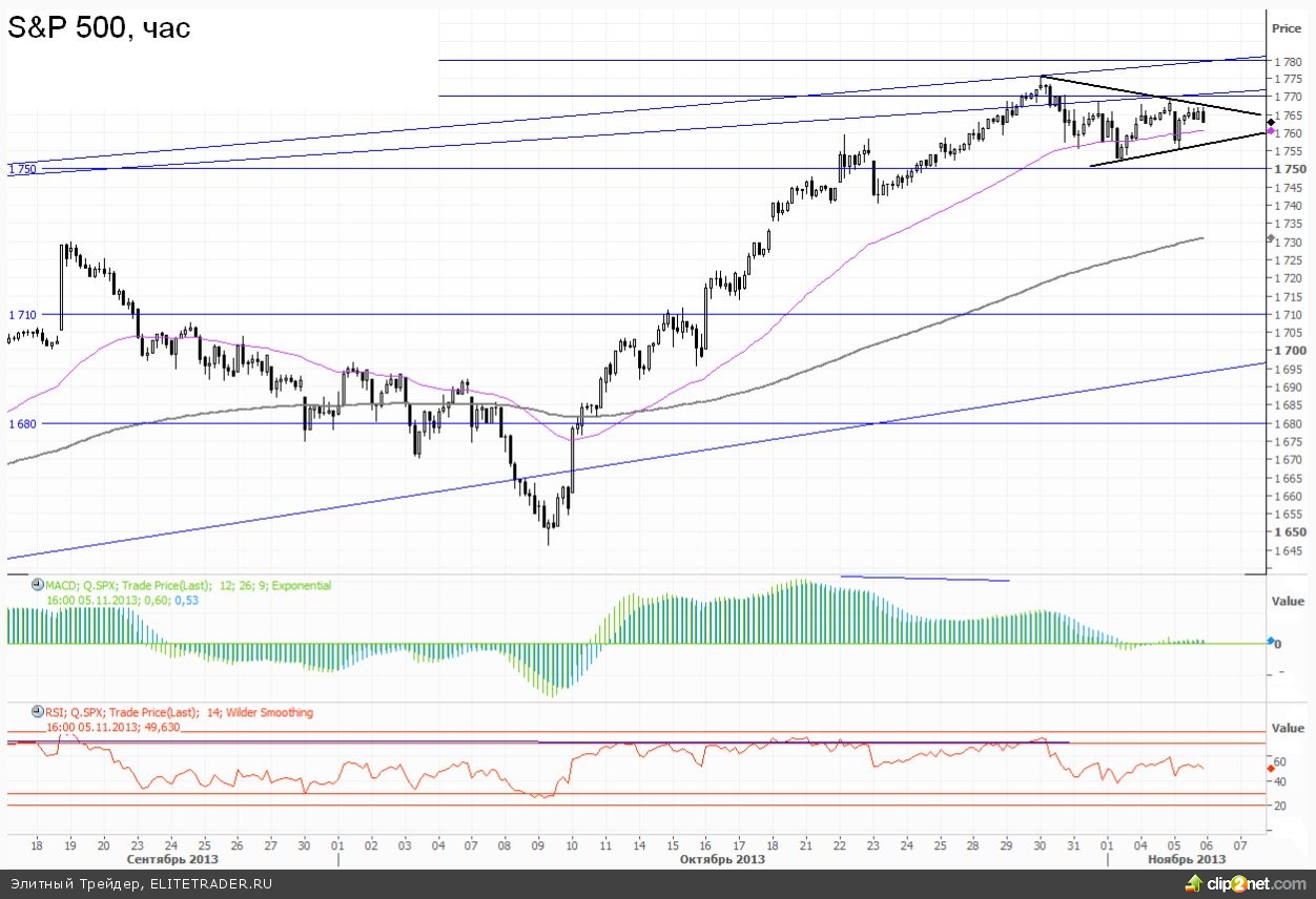 Что касается самых ближайших перспектив, то здесь все зависит от того, какая граница будет пройдена. Что касается 1780, то об этом уже было сказано выше, ну а если S&P500 удастся спуститься под 1750, то далее движение будет продолжено до следующей поддержки на 1710 (с промежуточной остановкой на 1730). В то же время отметим, что на часовом графике можно увидеть стандартный вымпел (сходящийся треугольник). Призываем внимательно следить за тем, в какую сторону раскроется эта формация.