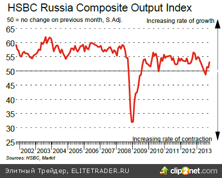 В свою очередь деловая активность в сфере услуг России и вовсе показала впечатляющий рост, добравшись до уровня 52,5, который является максимумов за последние 6 месяцев.