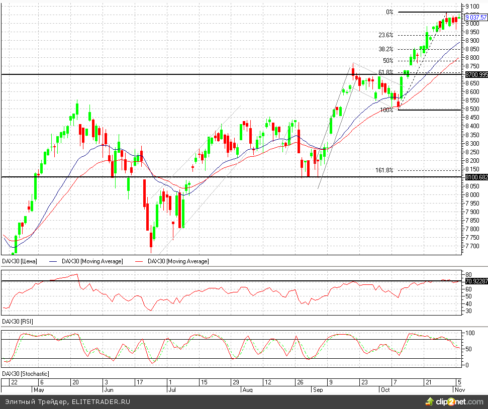 График индекса DAX вновь подбирается к своему локальному максимуму 9070 пунктов, зафиксированному 30 октября, и вполне может его пробить при условии того, что завтра Марио Драги порадует участников рынка после заседания ЕЦБ. В этом случае DAX откроет себе дорогу на уровень 9100, тем более что осцилляторы вполне позволяют ему сделать дополнительный рывок – Stochastic почти опустился до линии 50%, а RSI движется под линией перекупленности 70%.