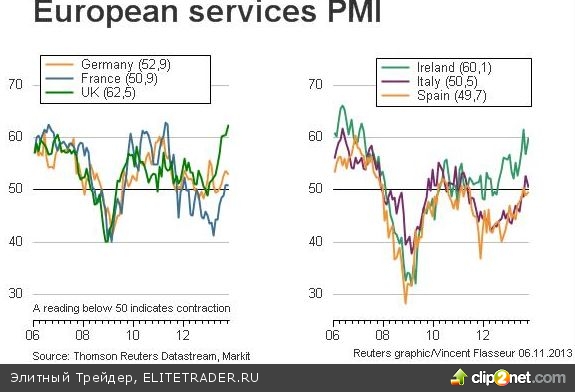 Индексы PMI в секторе услуг стран еврозоны, опубликованные в середине дня, оказались выше ожиданий рынков. Индикатор Франции вырос в октябре с 50.2 до 50.9 пунктов, показатель Германии увеличился с 52.3 до 52.9 пунктов, а композитный индекс PMI еврозоны составил 51.9 пунктов против ожидаемых 51.5 пунктов.