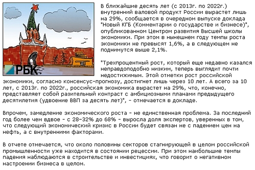 1. Главный риск России сегодня: низкое и снижающееся все более - причем в очень отвественный момент - качество государственного управления. Архаичное, не имеющее стратегии и просто последовательности в важнейших вопросах, персонализированное и притом недееспособное государство является не просто тормозящим социальное развитие, но лишает страну осмысленной перспективы. Это - белорусский путь, и Белоруссия нам намекает на то, что может быть с российской экономикой в случае, если, например, события в энергетике будут развиваться далее так, как они развиваются сегодня. Не создается механизма, системы управления страной и выработки решений, которая могла бы функционировать независимо от нынешней элиты; последняя, вдобавок, тривиально деградировала. Некоторые ее "решения" (в кавычках) вообще убийственны для страны: например, в области национальных отношений, "государственной" идеологии и т.п. Это, в целом, история хвоста (архаичного электората), который виляет собакой. Потому что у собаки поврежден мозг. Особо выдающийся "подвиг" этой элиты - ликвидация даже зачатков независимого правосудия и выведение из сферы законности целых корпораций, от силовиков до корпораций в смысле ОАО.