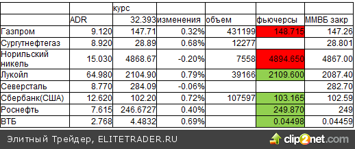 ADR в США 06.11 (Северсталь, Роснефть, ВТБ в Лондоне ) и закрытие вечерних фьючерсов в России Цветами (или знаками +-) далее изображен характер разницы по сравнению с закрытием вечерних фьючерсов ночью накануне. Евро/доллар))1.3517 в 7.43 четверга ))1.3514 в 7.47 среды))1.3503 в 8.01 вторника))