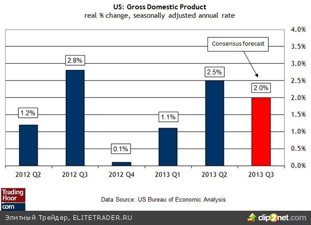 ВВП США за 3 кв. (13:30 GMT) Первоначальная оценка роста ВВП за третий квартал заставит участников рынка переключить свое внимание на проблему невысоких темпов экономического роста и на вопрос о том, как долго это может продолжаться без угрозы для более широкой макроэкономической картины. Консенсус-прогноз предусматривает рост на 2% по сравнению с аналогичным периодом прошлого года в предварительном отчете правительства о темпах роста ВВП за третий квартал, что также соответствует моему эконометрическому прогнозу. Это будет означать ухудшение по сравнению с показателем второго квартала на уровне 2,5%, который также считается невысоким. Не так давно аналитики предупреждали, что экономике США грозит замедление темпов роста и что риск рецессии возрастает. Но народ никак не хочет признавать тот факт, что вялые темпы роста способны иметь серьезные циклические последствия. Сегодняшний отчет о росте ВВП, скорее всего, принесет с собой новые доказательства этой теории.