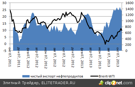Напомню, рост спреда между Brent и WTI в конце октября до $13,3 за баррель, максимума с апреля текущего года, способствовал повышению активности американских экспортеров, что в конечном счете отражается на величине запасов черного золота.