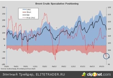 Самое интересное, что рост шортов, сколь бы опасным он не представлялся в связи с достижением показателем экстремального уровня и риском закрытия позиций по стоп-ордерам, происходил в период, когда котировки Brent находились в диапазоне $107-111 за баррель, а новости носили скорее позитивный характер. То есть речь идет о постепенном накоплении коротких позиций со стороны хедж-фондов, которые способны привести к продолжению нисходящего движения.