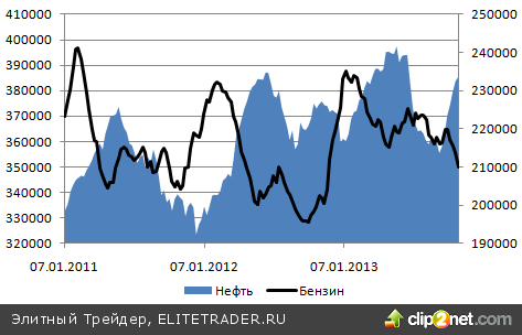 Динамика запасов нефти и бензина в США, тыс. баррелей