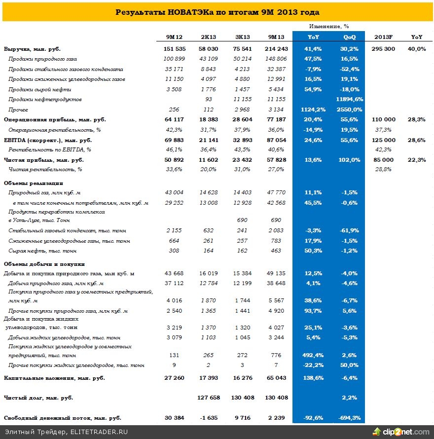 В целом результаты НОВАТЭКа по итогам 3К13 выглядят неплохо. На рынках природного газа и нефтепродуктов наблюдалась благоприятная конъюнктура, что на фоне относительно скромных операционных результатов позволило показать очень уверенную динамику всех основных финансовых показателей.