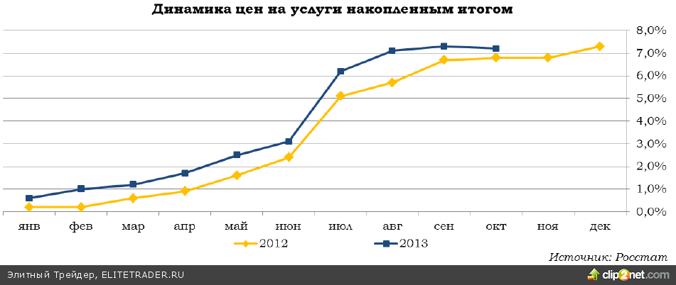 Стоимость услуг неожиданно понизилась на 0,1%. В прошлом году наблюдалась обратная ситуация — рост цен на 0,1%. Сказалось окончание сезона отпусков: туроператоры предложили большие скидки на путевки (снижение цен в целом составило 1,5%, на туры внутри страны — на 3,0%), сократила свои аппетиты и железнодорожная монополия (-2,6%). Повышение тарифов на услуги ЖКХ составило 0,5% — новый отопительный сезон привел к росту соответствующих услуг на 0,6%.