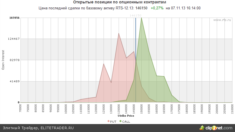 Между тем открытые опционные позиции по RIZ3 со сроком исполнения 15.11.13 сейчас находятся в нейтральном положении и не дают ровным счетом никаких сигналов. Максимальное количество открытых опционов колл расположилось на уровне 150000, что говорит о сильном сопротивлении на этой отметке. При этом значительное количество открытых позиций по опционам пут находится в районе 145000 и 135000.