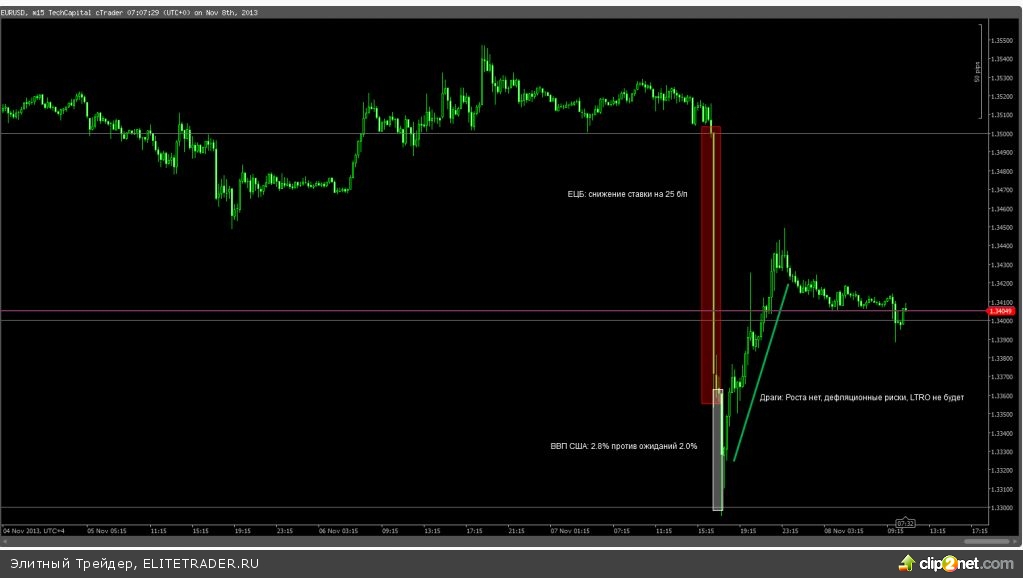 Эти новости вызвали падение евро до семинедельного минимума против доллара, так как снижение ставки снижает доходность, которую инвесторы могут получить по активам, деноминированным в евро. Пара евро/доллар EURUSD упала до 1,3295, но затем восстановилась до 1,3419. Тем не менее, она закрылась с понижением на 0,7% против уровня закрытия среды.