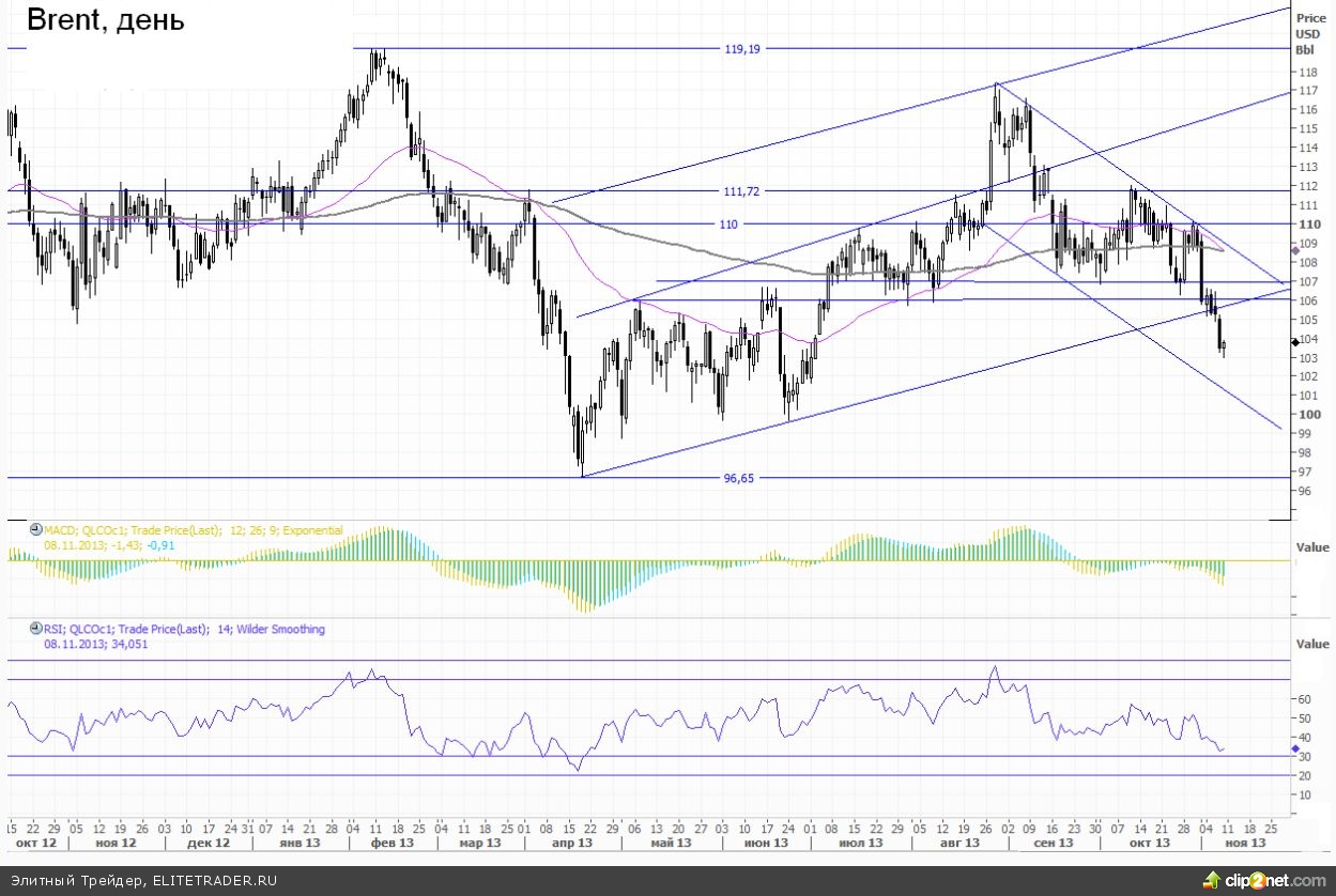 В четверг на рынке черного золота произошло то, о чем мы предупреждали все последние дни. После того как цена декабрьских фьючерсов на Brent прошла свою зону поддержки и опустилась ниже $105 за баррель, нисходящая динамика получила ускорение. В данный момент котировки находятся на минимумах с июля. Все идет к тому, что движение с коррекцией или без, но будет продолжено, и мы направимся в сторону ближайшей остановки, которая планируется в районе круглой отметки в $100.