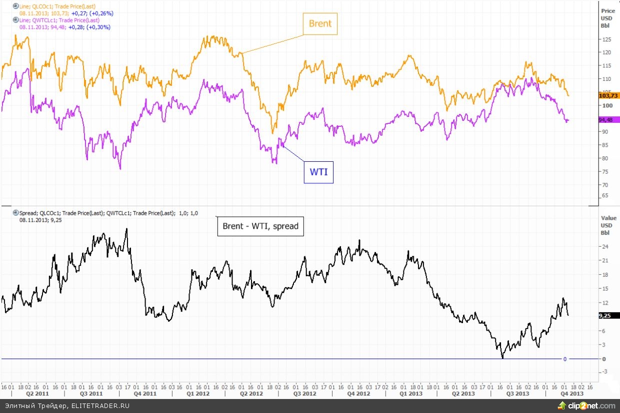 На конец недели декабрьские нефтяные фьючерсы марки Brent находятся вблизи отметки в $103,8. С прошлой пятницы они понизились на 2,3%, стоимость WTI упала до $94,5, опустившись на 0,1%. Спред между марками сократился и в данный момент составляет около $9,3.