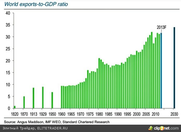 Мир стал более открытым из-за роста экспорта. Экономисты из Standard Chartered проанализировали динамику мирового экспорта в процентном соотношении от мирового ВВП. Этот показатель стремительно рос в последние 200 лет.