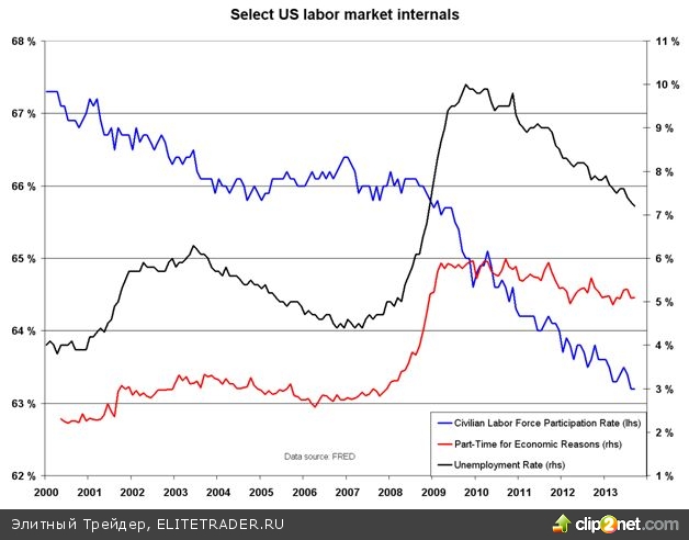 В сентябре доля экономически активного населения достигла нового минимума, и тенденция выглядит ужасающе. Доля населения, занятая на работе с частичной занятостью, также не снижается. Улучшения на рынке труда все еще не настолько значительные, как этого хотела бы ФРС, поэтому интересно узнать, как долго она будет пропагандировать «день сворачивания программы стимулирования».