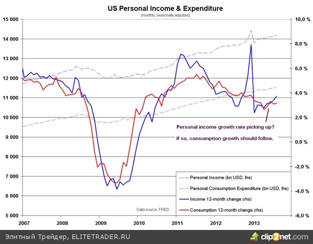 Личные доходы и расходы в США за сентябрь (13:30 GMT): Ожидается, что личные доходы выросли на 0,3%, а расходы — на 0,2%. Сентябрьские данные к настоящему моменту уже немного устарели, и за это время произошли важные изменения (неожиданное решение не сворачивать программу стимулов и закрытие правительства). Тем не менее, эти данные могут подтвердить формирование очень важных тенденций. Годовые темпы изменения личных доходов за последние месяцы увеличились и указывают на потенциальный рост. Впоследствии это должно привести к увеличению расходов. Если потребительская активность будет развиваться, то это однозначно будет хорошей новостью для экономики в целом. Вспомните скачок доходов в декабре 2012 года, когда компании выплатили специальные дивиденды, однако за этим разовым событием последовало резкое ухудшение в январе. Таким образом, годовые темпы вскоре могут стать довольно неустойчивыми. В блоге Sober Look тема показателей за декабрь 2012 года обсуждалась еще в марте.