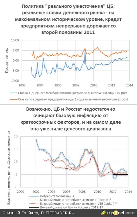 В целом надо признать, что политика «реального ужесточения» денежно-кредитных условий, проводимая ЦБ (когда реальные ставки растут при сохранении номинальных или снижения их по малоупотребительным операциям) является достаточно весомым фактором циклического торможения экономики. «Реальные» ставки по корпоративным кредитам превышают многолетние максимумы, а ставка денежного рынка вообще находится на историческом максимуме, исключая острую фазу последнего кризиса.