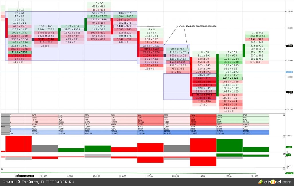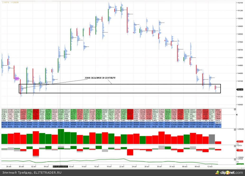 Помню тот день 30 сентября по футпринту. Очень плотное скопление объемов на футпринте. Экстремальный страх в виде отрицательной дельты, но цена идет туго. Сильнейшее сжатие, которое потом проявило себя в росте до 152 000 пунктов. Перед этим, правда, отстоялись несколько дней в диапазоне 142-144,5к.